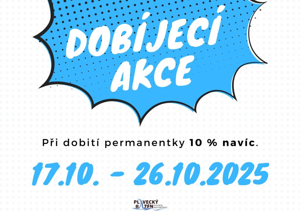 Read MoreV termínu 17.10.2025. – 26.10.2025 probíhá oblíbená dobíjecí akce. Při dobití permanentky v tento termín získáte 10 % z dobíjené částky navíc. Tato…