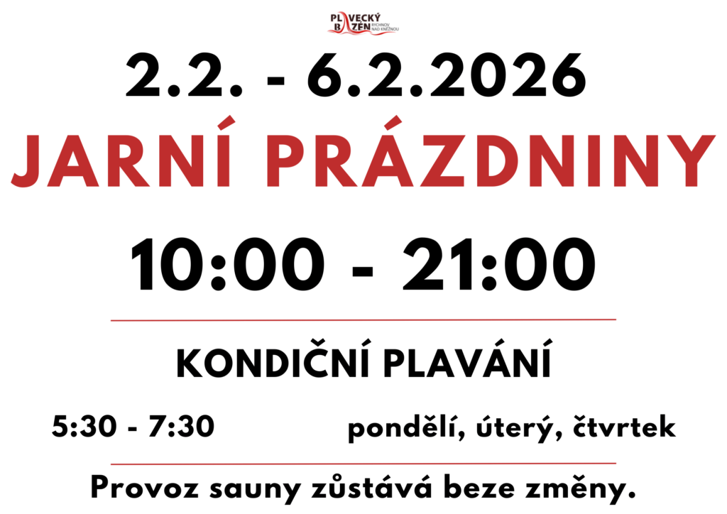 VíceO jarních prázdninách v termínu 2.2. – 6.2.2026 dojde ke změně otevírací doby. Bazén bude otevřen již od 10:00 hod. …