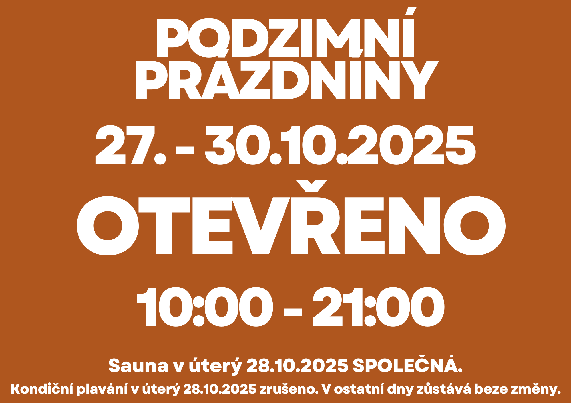 Kondiční plavání v úterý 28.10.2025 zrušeno. V pondělí 27.10.2025 a čtvrtek 30.10.2025 běžně v čase 5:30 – 7:30 hod.