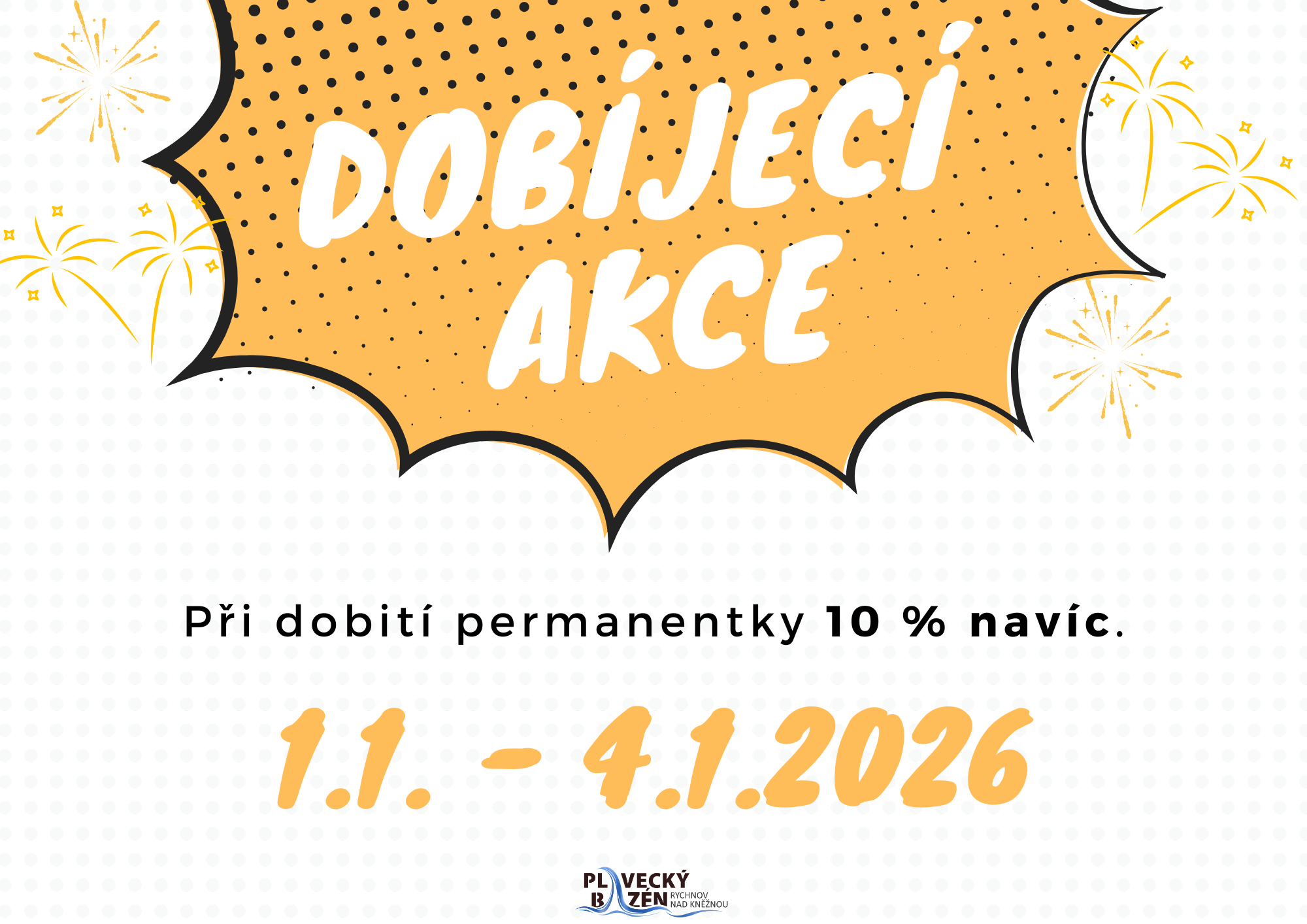 V termínu 1.1.2026. – 4.1.2026 probíhá oblíbená dobíjecí akce. Při dobití permanentky v tento termín získáte 10 % z dobíjené částky navíc.